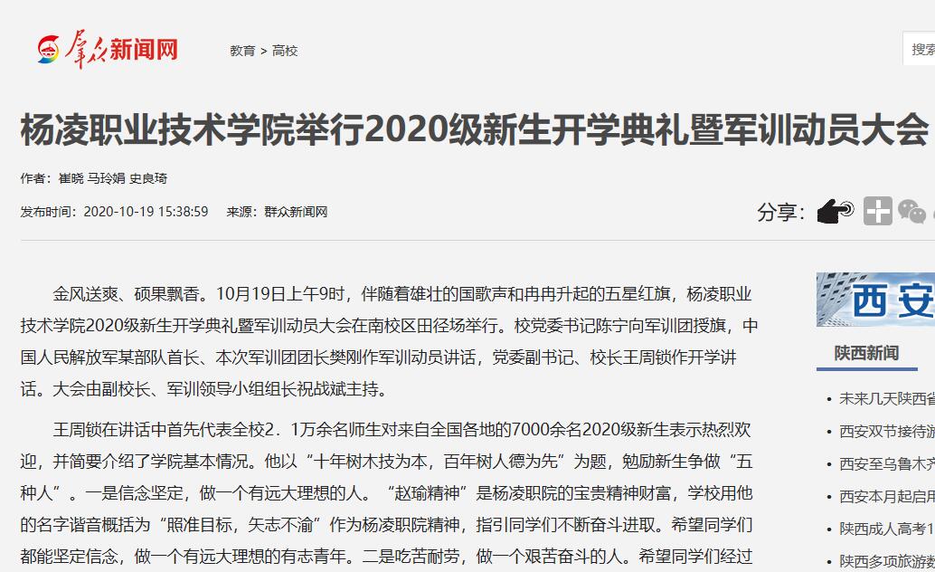 【群众新闻网】杨凌职业技术学院举行2020级新生开学典礼暨军训动员大会