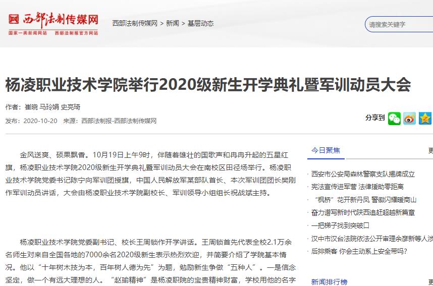 【西部法制传媒网】杨凌职业技术学院举行2020级新生开学典礼暨军训动员大会