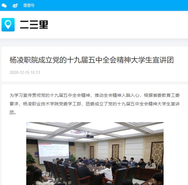 为学习宣传贯彻党的十九届五中全会精神,推动全会精神入脑入心,根据省委教育工委要求,杨凌职业技术学院党委学工部、团委成立了党的十九届五中全会精神大学生宣讲团。