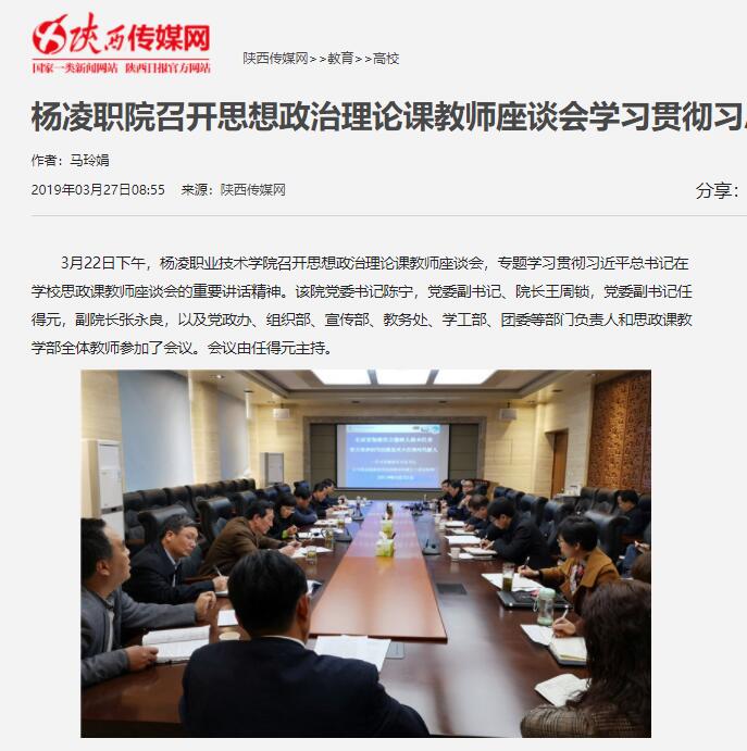 3月22日下午,杨凌职业技术学院召开思想政治理论课教师座谈会,专题学习贯彻习近平总书记在学校思政课教师座谈会的重要讲话精神。该院党委书记陈宁,党委副书记、院长王周锁,党委副书记任得元,副院长张永良,以及党政办、组织部、宣传部、教务处、学工部、团委等部门负责人和思政课教学部全体教师参加了会议。会议由任得元主持。