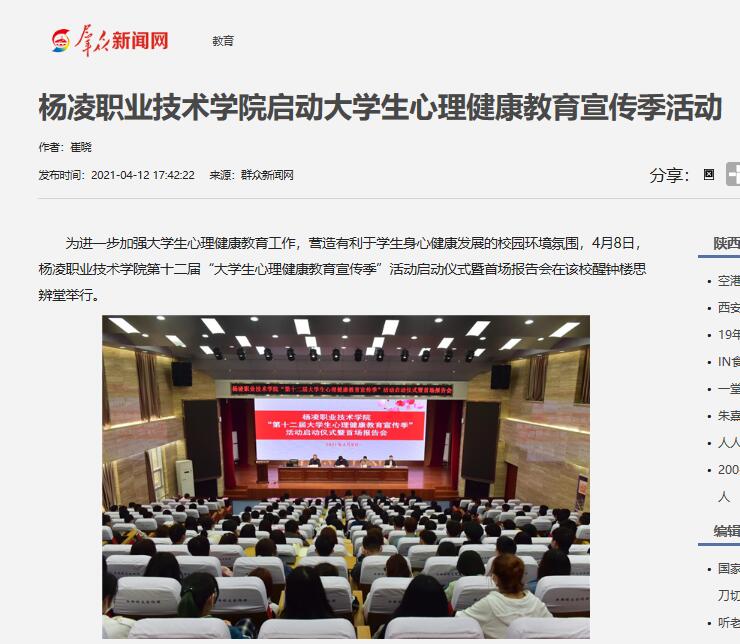为进一步加强大学生心理健康教育工作,营造有利于学生身心健康发展的校园环境氛围,4月8日,杨凌职业技术学院第十二届“大学生心理健康教育宣传季”活动启动仪式暨首场报告会在该校醒钟楼思辨堂举行。