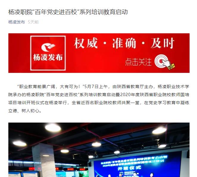 “职业教育前景广阔,大有可为!”5月7日上午,由陕西省教育厅主办,杨凌职业技术学院承办的杨凌职院“百年党史进百校”系列培训教育启动暨2020年度陕西省职业院校教师国培项目培训开班仪式在杨凌举行,全省近百名职业院校教师共聚一堂,在党史学习教育中凝练立德、树人初心。