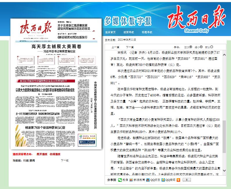 【陕西日报】头版:杨凌第768个新品种获审(认)定