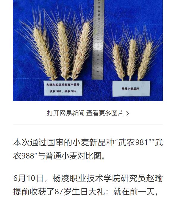 6月10日,杨凌职业技术学院研究员赵瑜提前收获了87岁生日大礼:就在前一天,他培育的小麦新品种“武农988”“武农981”通过国审!至此,杨凌共有768个动植物品种获审(认)定。