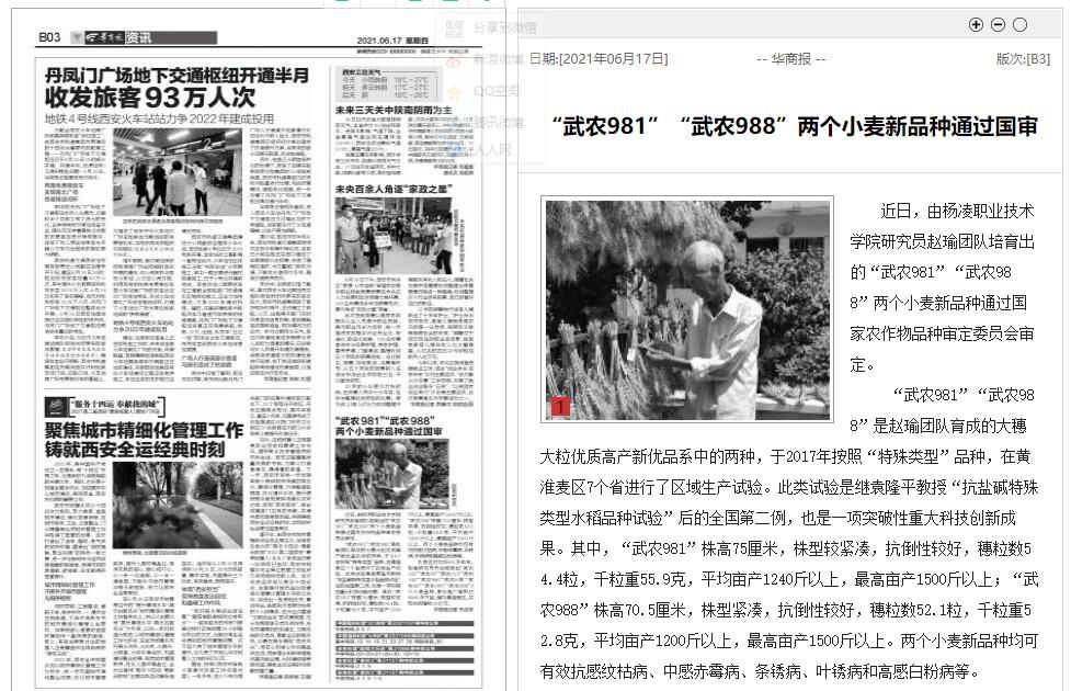 【华商报】“武农981”“武农988”两个小麦新品种通过国审