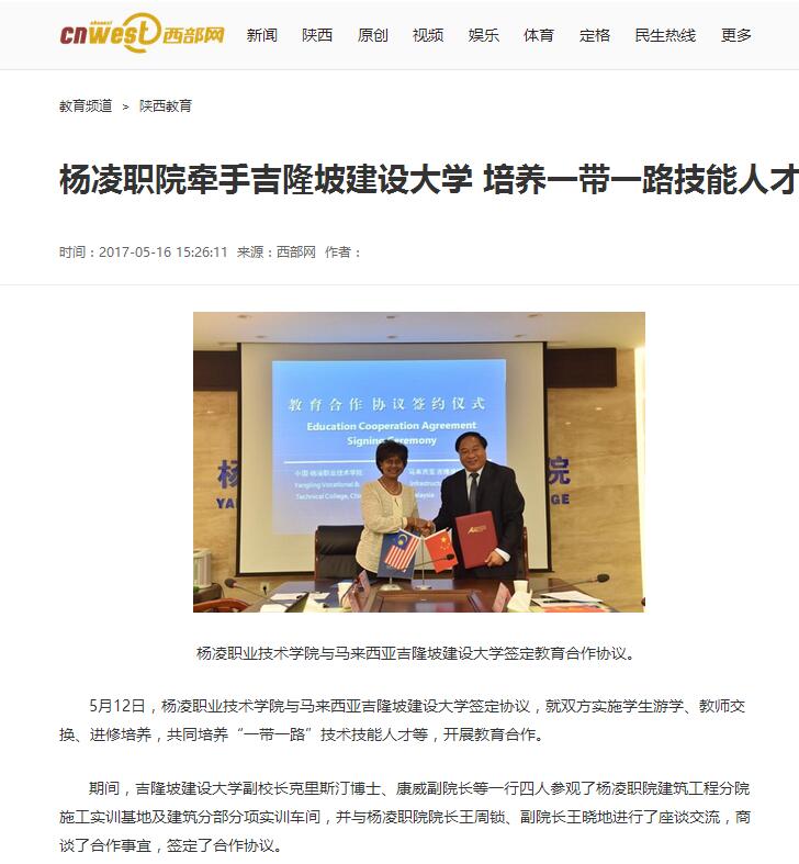 【西部网】杨凌职院牵手吉隆坡建设大学 培养一带一路技能人才