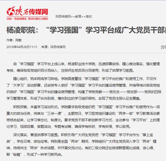 自“学习强国”学习平台上线以来,杨凌职业技术学院,迅速部署安排,精心推动落实,强化管理考核,确保各级党组织百分百纳入、注册师生党员百分百使用,形成了浓厚学习氛围。