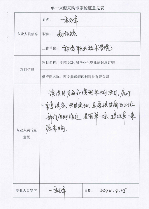 杨凌职业技术学院2024届毕业证封皮订购项目,根据项目立项相关资料及专家论证意见,拟采用单一来源采购方式,该项目拟由西安鼎盛源印制科技有限公司承担。现将有关情况向潜在的供应商广泛征求意见。