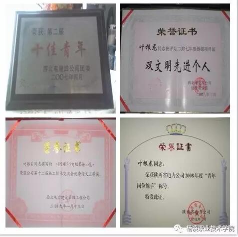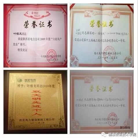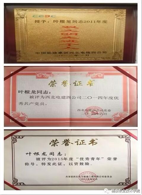 由于叶根龙工作中勤奋好学、兢兢业业,在每一个岗位上他都不断反思总结,不断历练提高。因此,从2004年到2016年,在他参加工作的这十余年里,获得了无数奖励及荣誉:2005年3月被评为“户县项目部2004年度双文明先进个人”,4月荣获“2004年度陕西省电力公司优秀团支部书记”;2006年1月在公司第九届技术交流会上荣获“二等奖”;2007年2月在公司第十届技术交流会上荣获“一等奖”, 4月被评为西北电建四公司第二届“十佳青年”;2008年3月被评为“涟源项目部2007年度双文明先进个人”;2009年2月荣获陕西省电力公司2008年度“青年岗位能手”称号,1月在公司第十二届技术交流会上荣获“三等奖”,6月荣获陕西省电力公司2009年度“六好共产党员”称号;2010年2月在公司第十三届技术交流会上荣获“一等奖”;2011年2月荣获西北电建四公司2010年度“双文明先进个人“;2012年1月在公司第十五届技术交流会上荣获“一等奖”,2012年2月荣获西北电建四公司2011年度“双文明先进个人”;2014年6月被评为西北电建四公司2014年度“优秀共产党员”;2015年5月被评为西北有限公司2015年度“优秀青年”, 7月被评为公司2015年度“八大先锋共产党员”;2016年6月被评为公司2016年度“优秀共产党员”。