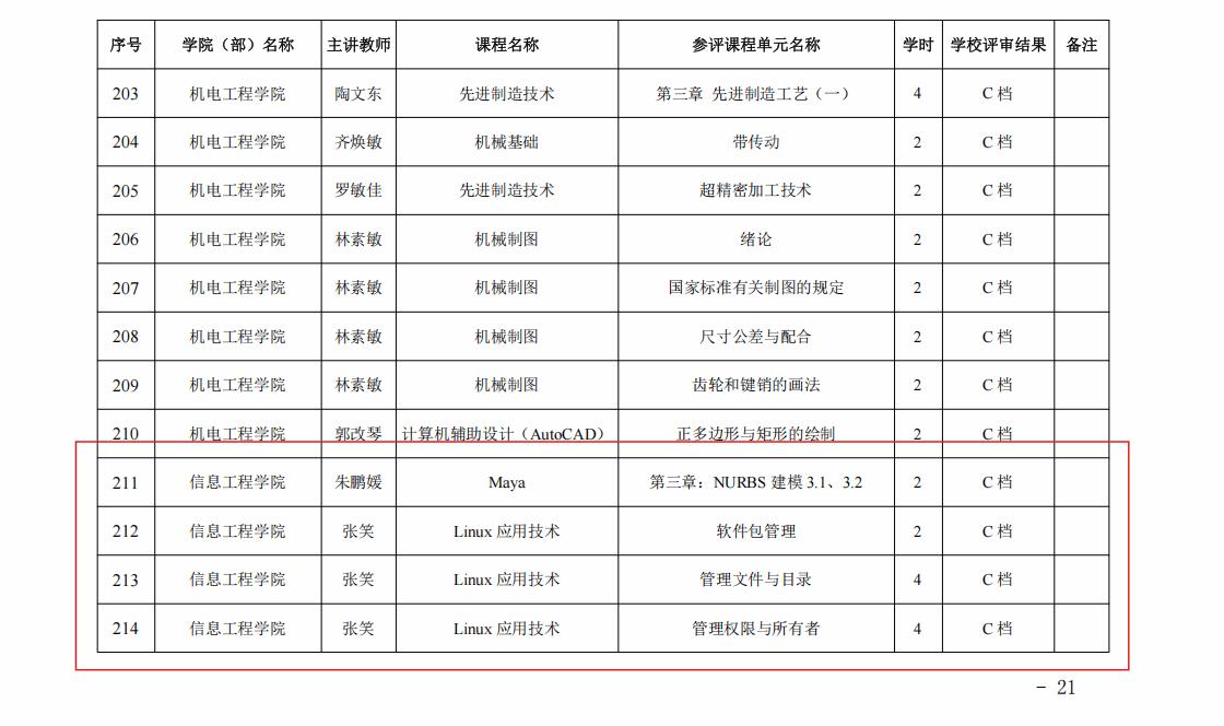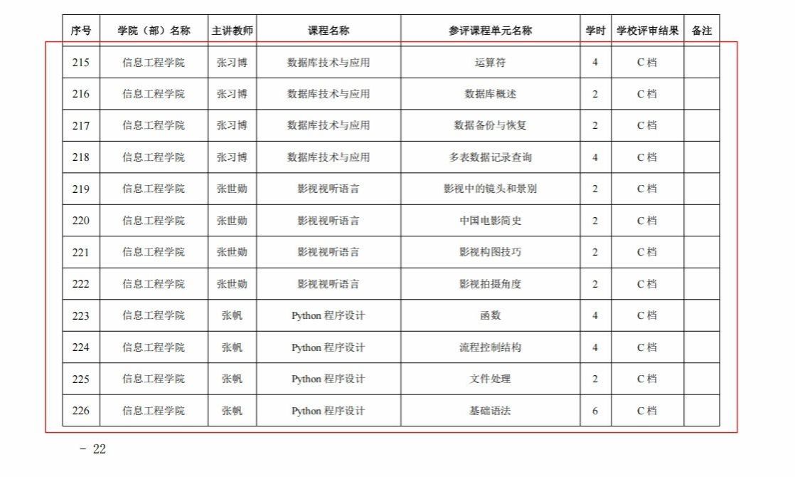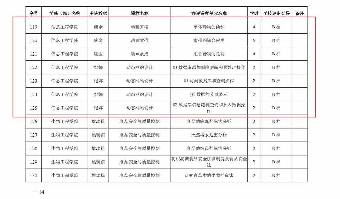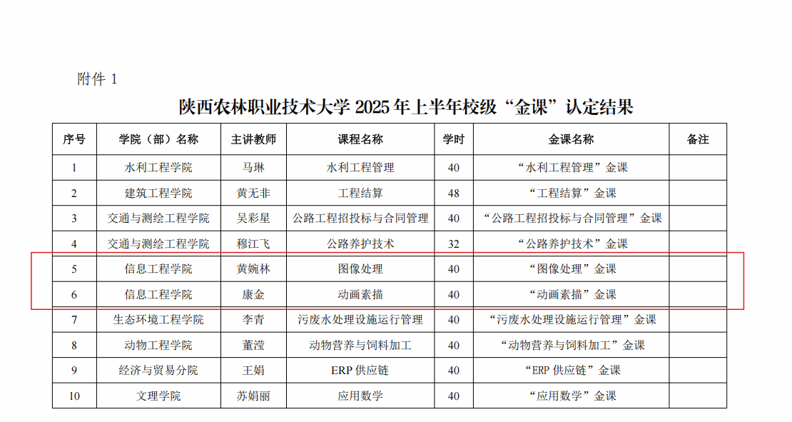 12月15日,陕西农林职业技术大学2025年下半年校级“单元金课” 评审结果公布,信息工程学院教师黄婉林主讲的《图像处理》、康金主讲的《动画素描》课程获得校级“金课”认定。本次共有65个“单元金课”评审通过,其中A档16个,B档22个,C档27个。