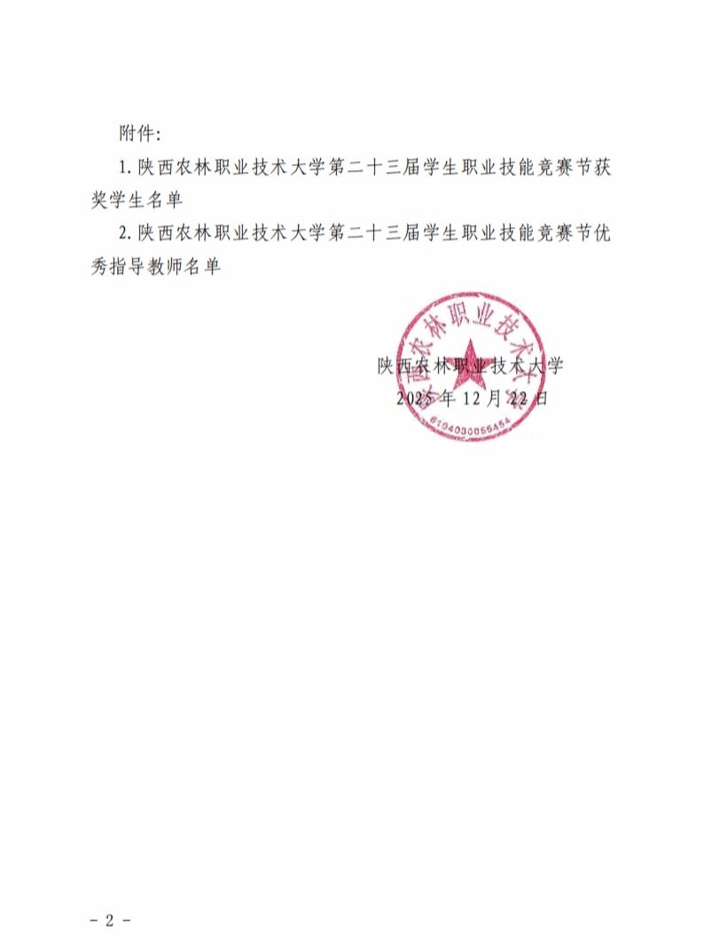 2025年12月25日,陕西农林职业技术大学发布《关于表彰第二十三届学生职业技能竞赛节获奖学生和优秀指导教师的通报》。我院董昊等56名学生以及杨静冰等5名指导教师获得学校表彰。