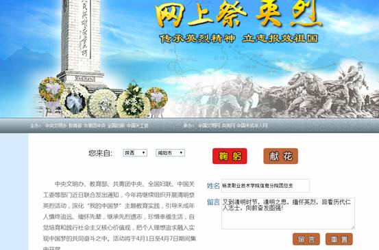 为弘扬革命先烈优秀品质,激发现代青年学生努力奋斗。作为我院“十大节庆”教育活动的组成部分之一。信息工程分院团总支组织本分院各团支部、学生社团在4月1日至4月5日通过手机、电脑等终端登录“中国文明网”积极参与到覆盖全国的“网上祭英烈”活动当中。